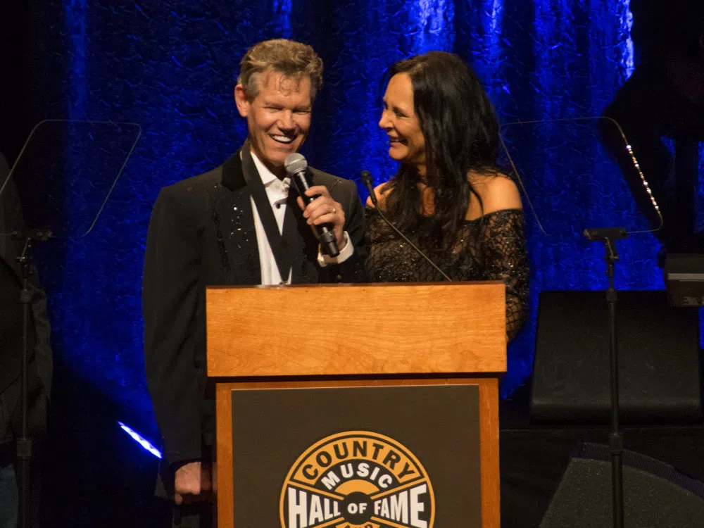 Flanked by his wife, Mary Davis-Travis, and Garth Brooks, who formally introduced the new Hall of Fame member, Randy rose from his wheelchair during his acceptance speech, which was delivered by his wife.
