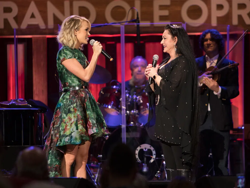 Carrie Underwood surprised the crowd at the Grand Ole Opry last night (Nov. 15) when she joined Crystal Gayle onstage to sing Crystal’s No. 1 hit, “Don’t It Make My Brown Eyes Blue.” But that wasn’t the only surprise Carrie had up her sleeve. After finishing the duet, Carrie invited Crystal to become a member of the Opry.