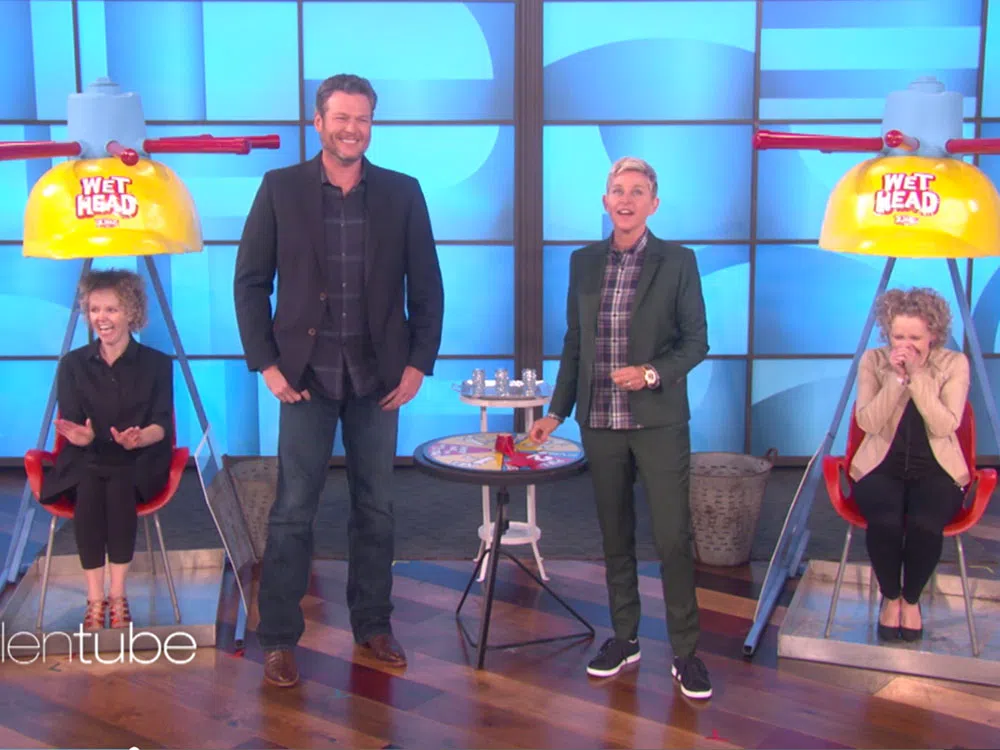 While on the show Blake was roped into playing a game of Wet Head with Ellen and two contestants from the audience.