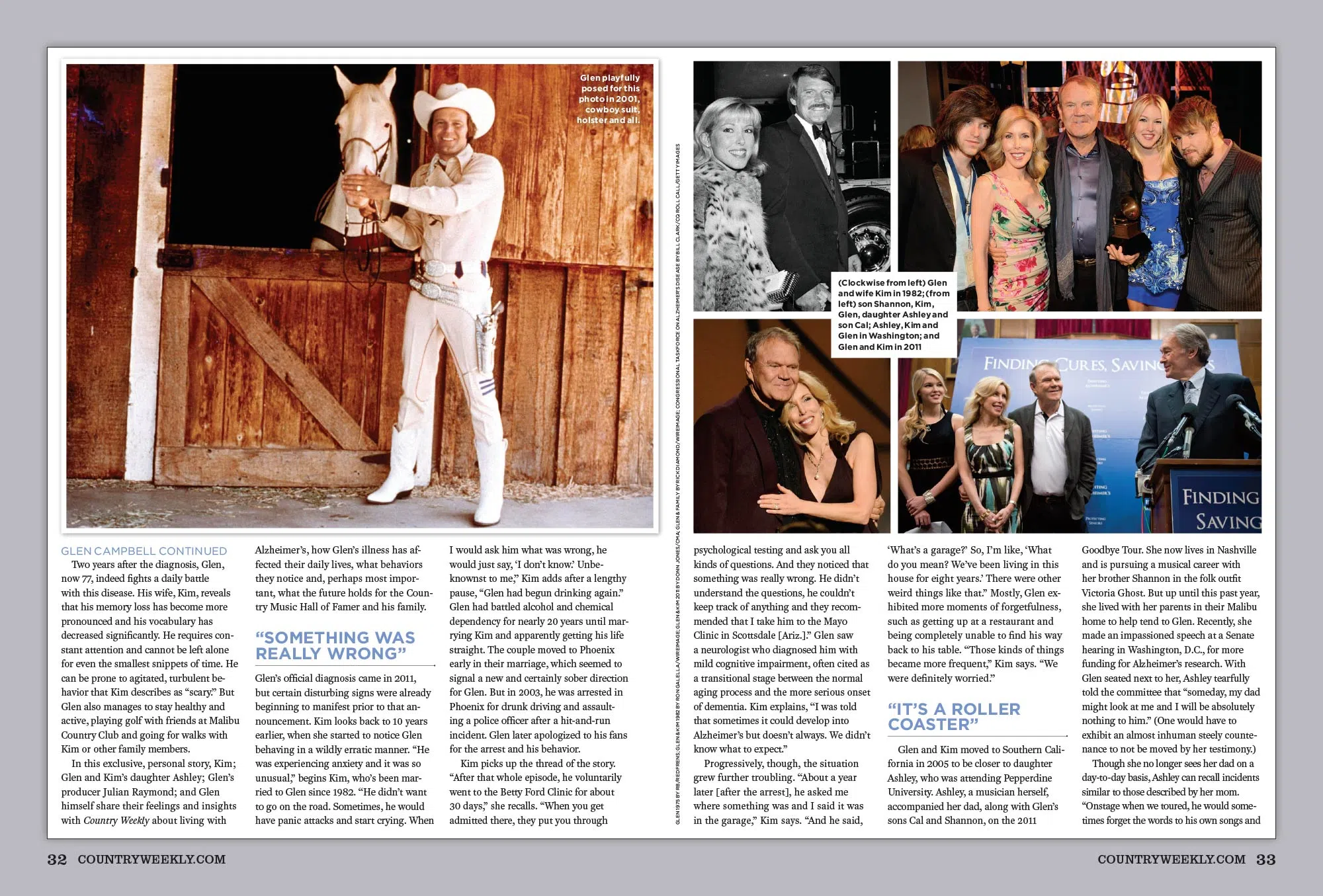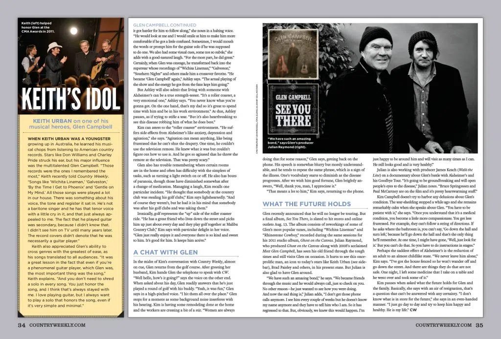 In this exclusive, personal story, Kim; Glen and Kim’s daughter Ashley; Glen’s producer Julian Raymond; and Glen himself share their feelings and insights with Country Weekly about living with Alzheimer’s, how Glen’s illness has affected their daily lives, what behaviors they notice and, perhaps most important, what the future holds for the Country Music Hall of Famer and his family.