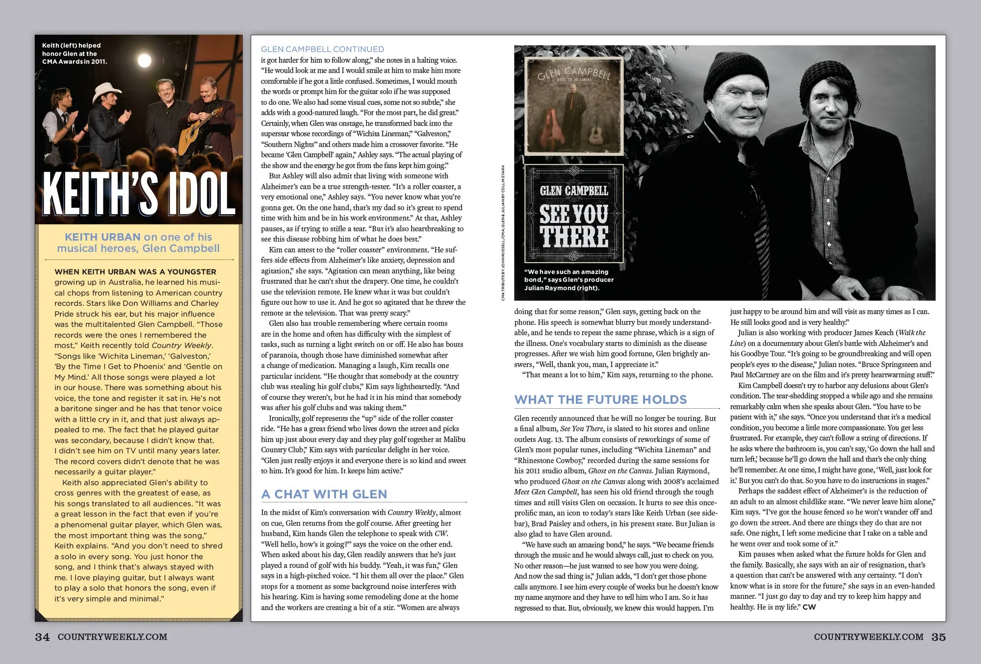 Glen recently announced that he will no longer be touring. But a final album, See You There, is slated to hit stores and online outlets Aug. 13. The album consists of reworkings of some of Glen’s most popular tunes, including “Wichita Lineman” and “Rhinestone Cowboy,” recorded during the same sessions for his 2011 studio album, Ghost on the Canvas. Julian Raymond, who produced Ghost on the Canvas along with 2008’s acclaimed Meet Glen Campbell, has seen his old friend through the tough times and still visits Glen on occasion. It hurts to see this once-prolific man, an icon to today’s stars like Keith Urban (see sidebar), Brad Paisley and others, in his present state. But Julian is also glad to have Glen around.