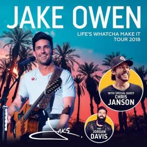 “I really do believe that life’s whatcha make it,” says Jake. “If you wake up feeling positive, there’s a pretty good chance that you’ll see things throughout the day in a positive light. I think concerts are like that: it’s what you make it. People show up to have a good time and the artists on stage feel that too. A lot of my songs over the years have pointed to that idea. The fact that we’re playing baseball parks on Friday and Saturday nights throughout the summer, when people are ready to get out, have a good time, and don’t have to work the next day, is really cool. And, I’m so pumped to have Chris Janson and Jordan Davis on the bill with me. It’s going to be an awesome tour. I’m fired up.”