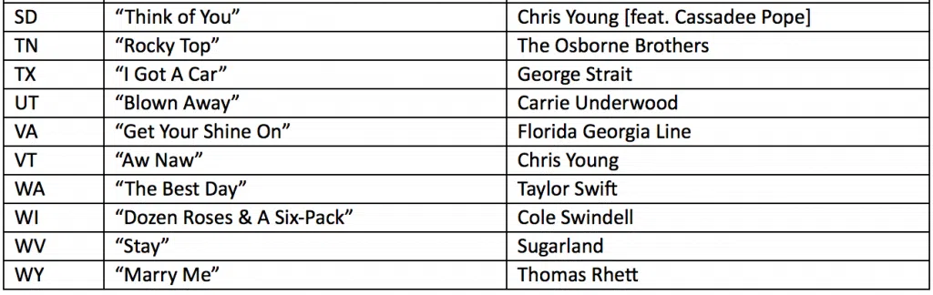 - Miranda Lambert had the top song in Alaska, Maine and Oklahoma.