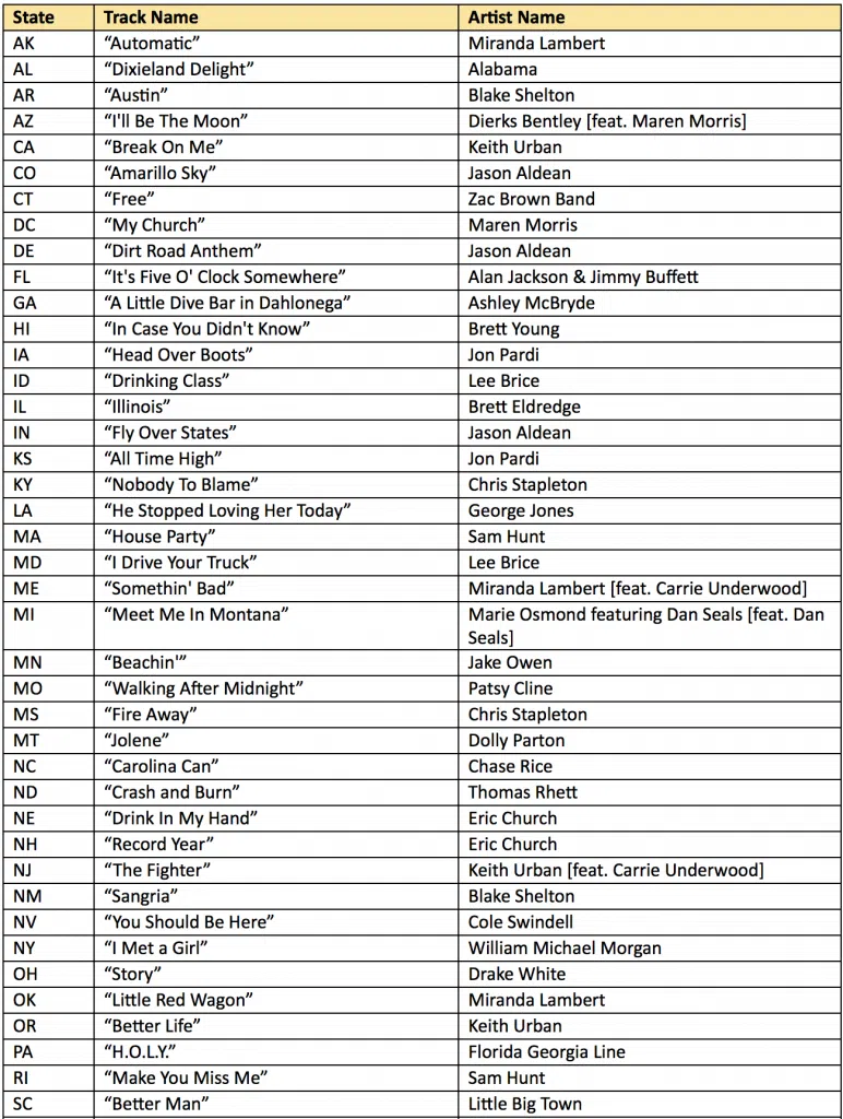 - Miranda Lambert had the top song in Alaska, Maine and Oklahoma.