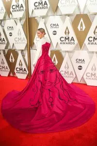 The Grammy-winning artist made a fashion statement that endeavored to highlight country radio’s gender disparity by wearing a white Christian Siriano pantsuit with a red cape that was inscribed by artist Alice Mizrachi with the words “Play our f*@#in records please and thank you.”
