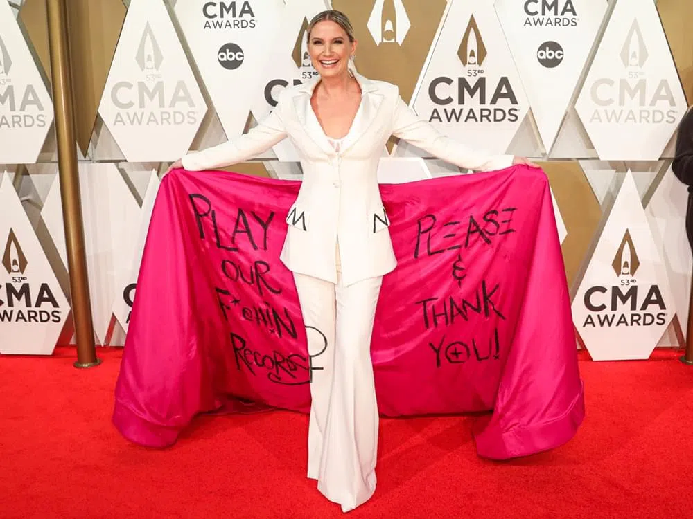 The Grammy-winning artist made a fashion statement that endeavored to highlight country radio’s gender disparity by wearing a white Christian Siriano pantsuit with a red cape that was inscribed by artist Alice Mizrachi with the words “Play our f*@#in records please and thank you.”